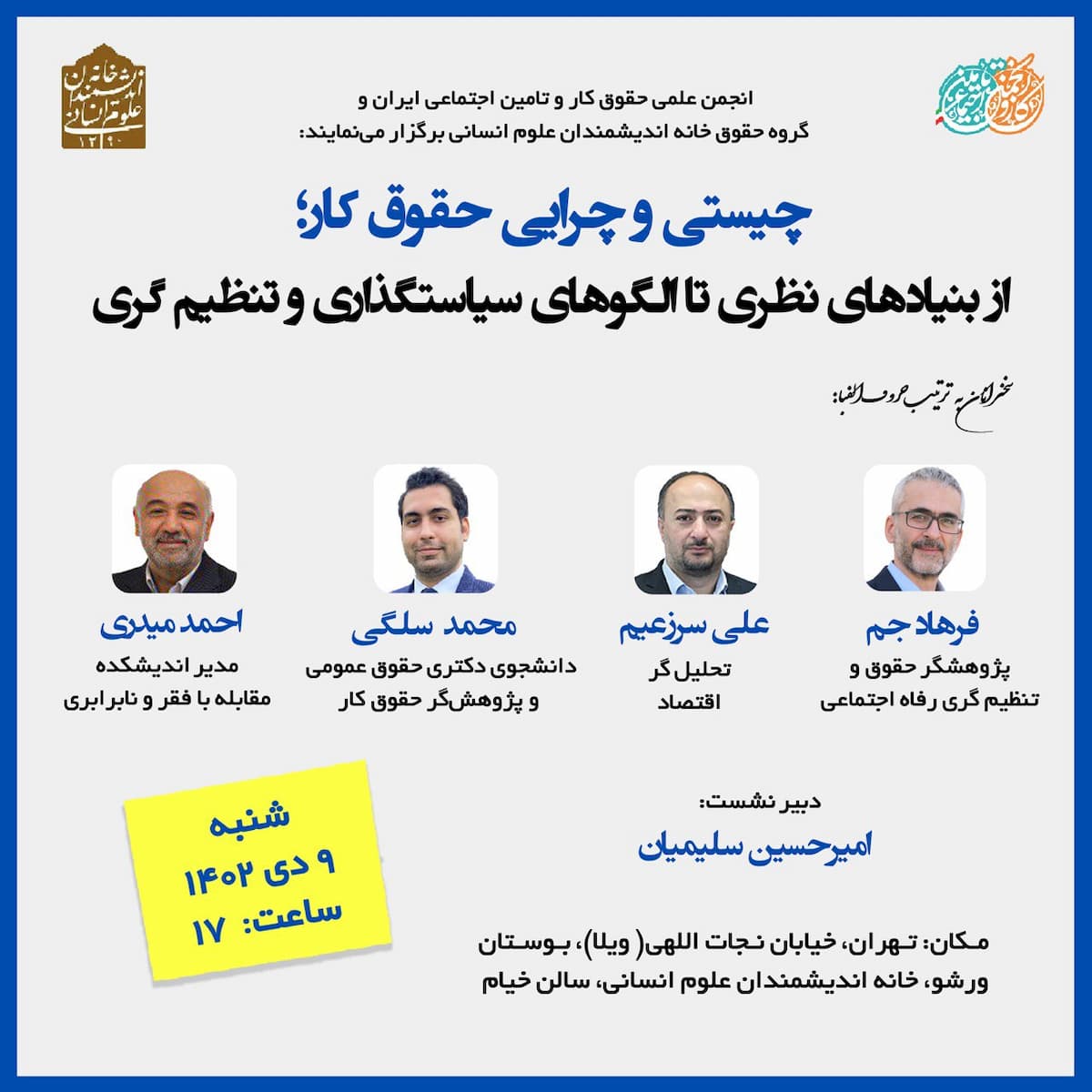 نشست "چیستی و چرایی حقوق کار" روز شنبه ۹ دی در سالن خیام خانه اندیشمندان علوم انسانی برگزار می شود.