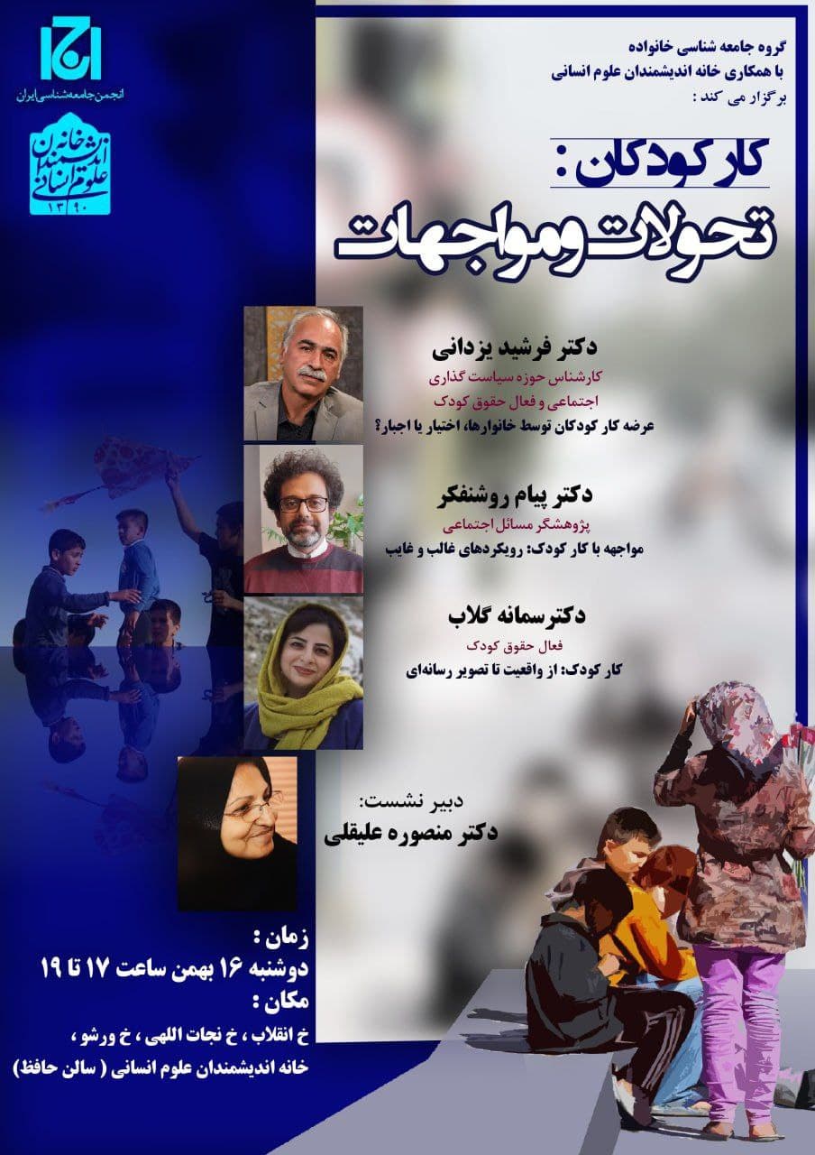 نشست "کار کودکان: تحولات و مواجهات" روز دوشنبه ۱۶ بهمن در سالن حافظ خانه اندیشمندان علوم انسانی برگزار می شود.