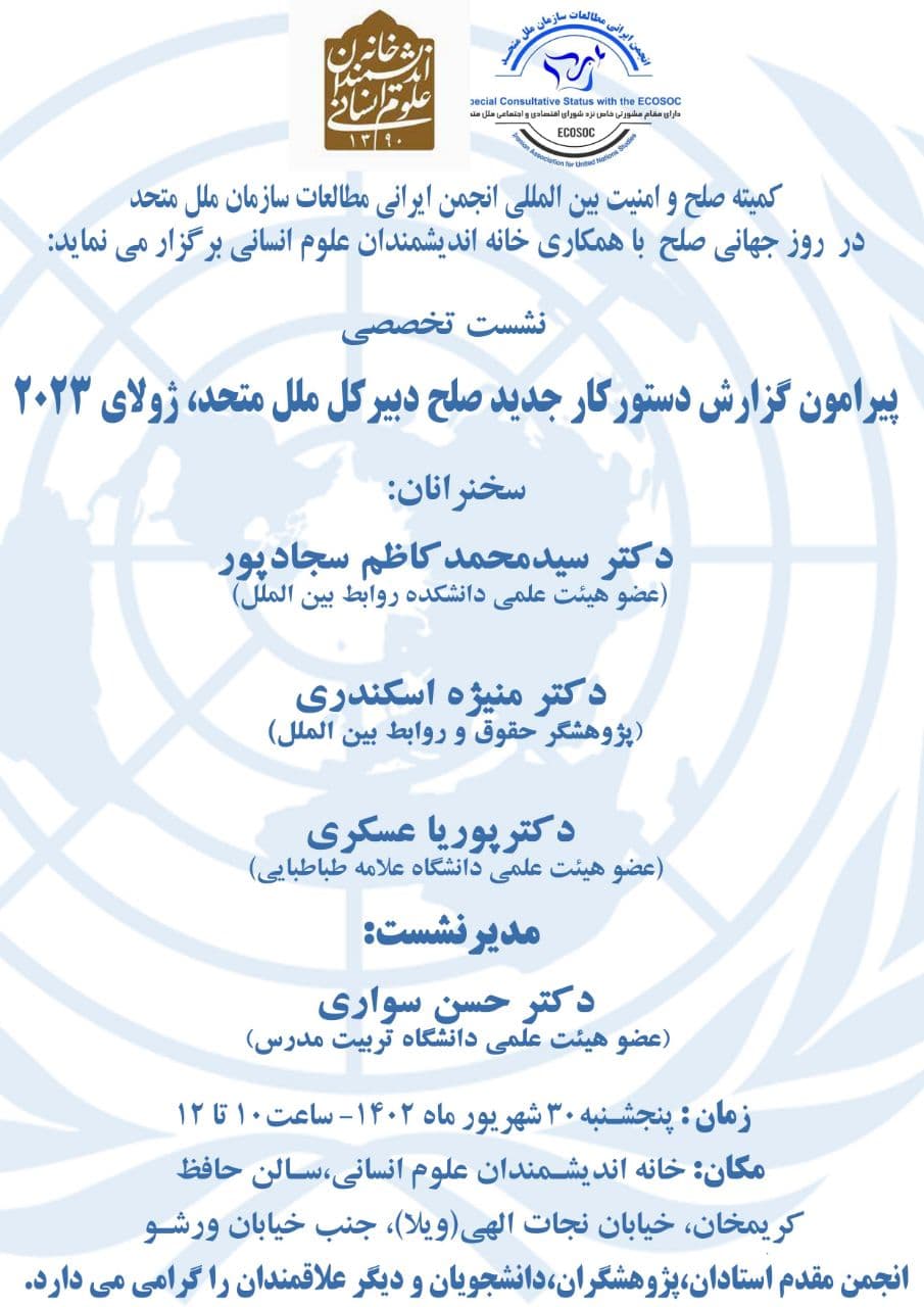 نشست " گزارش دستور کار جدید صلح دبیرکل ملل متحد" روز پنج شنبه ۳۰ شهریور در سالن حافظ خانه اندیشمندان علوم انسانی برگزار می شود.