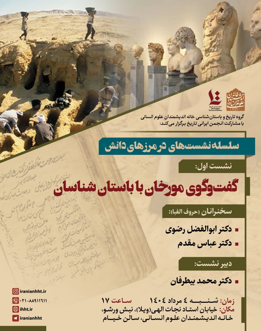 به گزارش روابط عمومی خانه اندیشمندان علوم انسانی، نشست "گفت و گوی مورخان با باستان شناسان" به همت گروه تاریخ و باستان شناسی خانه اندیشمندان علوم انسانی، روز شنبه 4 مرداد 1404 ساعت 17 در سالن خیام خانه اندیشمندان علوم انسانی برگزار می شود.