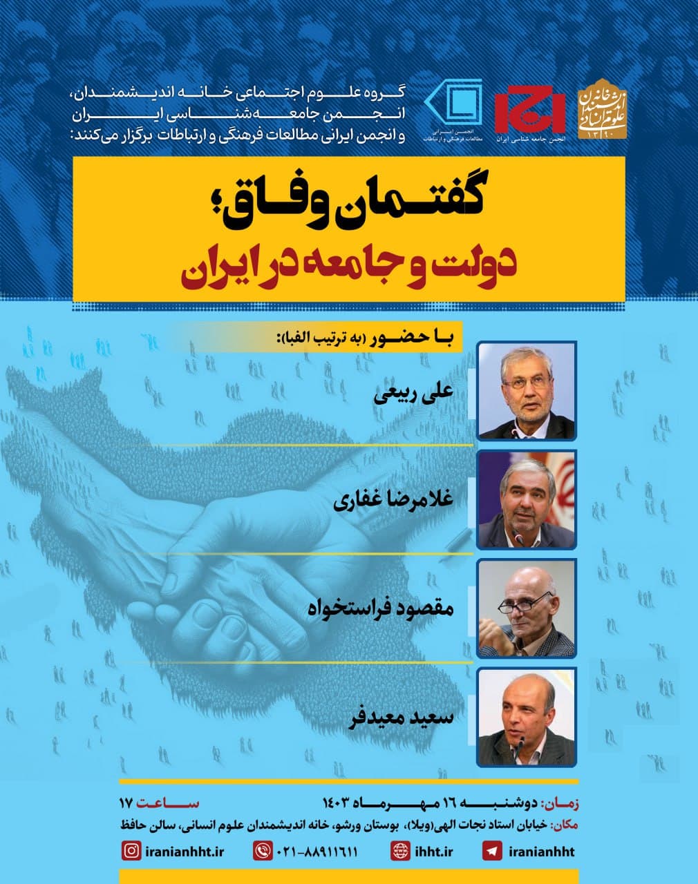 نشست "گفتمان وفاق؛ دولت و جامعه در ایران" روز دوشنبه 16 مهر در سالن حافظ خانه اندیشمندان علوم انسانی برگزار می شود.