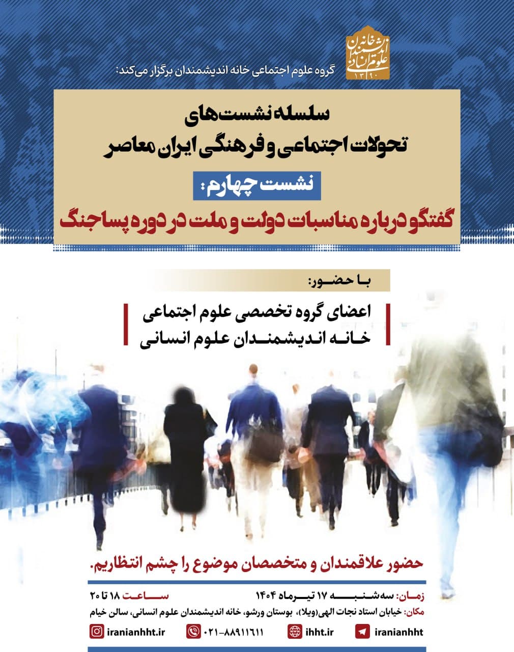 نشست "گفتگو درباره مناسبات دولت و ملت در دوره پساجنگ" روز سه شنبه 17 تیر در سالن خیام خانه اندیشمندان علوم انسانی برگزار می شود.