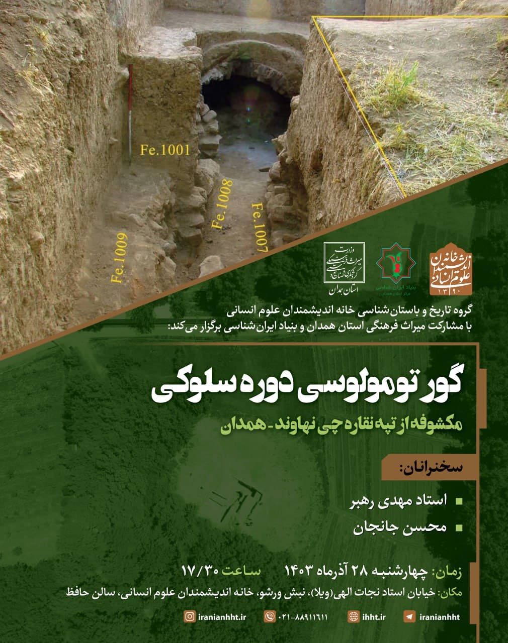 به گزارش روابط عمومی خانه اندیشمندان علوم انسانی، نشست "گور تومولوسی دوره سلوکی" به همت گروه تاریخ و باستان شناسی خانه اندیشمندان علوم انسانی و با مشارکت میراث فرهنگی استان همدان و بنیاد ایران شناسی، روز چهارشنبه 28 آذر 1403 ساعت 17:30 در سالن حافظ خانه اندیشمندان علوم انسانی برگزار می شود.