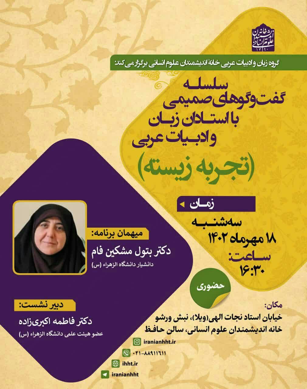 نشست "گپ و گفت با اساتید زبان و ادبیات عربی" روز سه شنبه ۱۸ مهر در سالن حافظ خانه اندیشمندان علوم انسانی برگزار می شود.