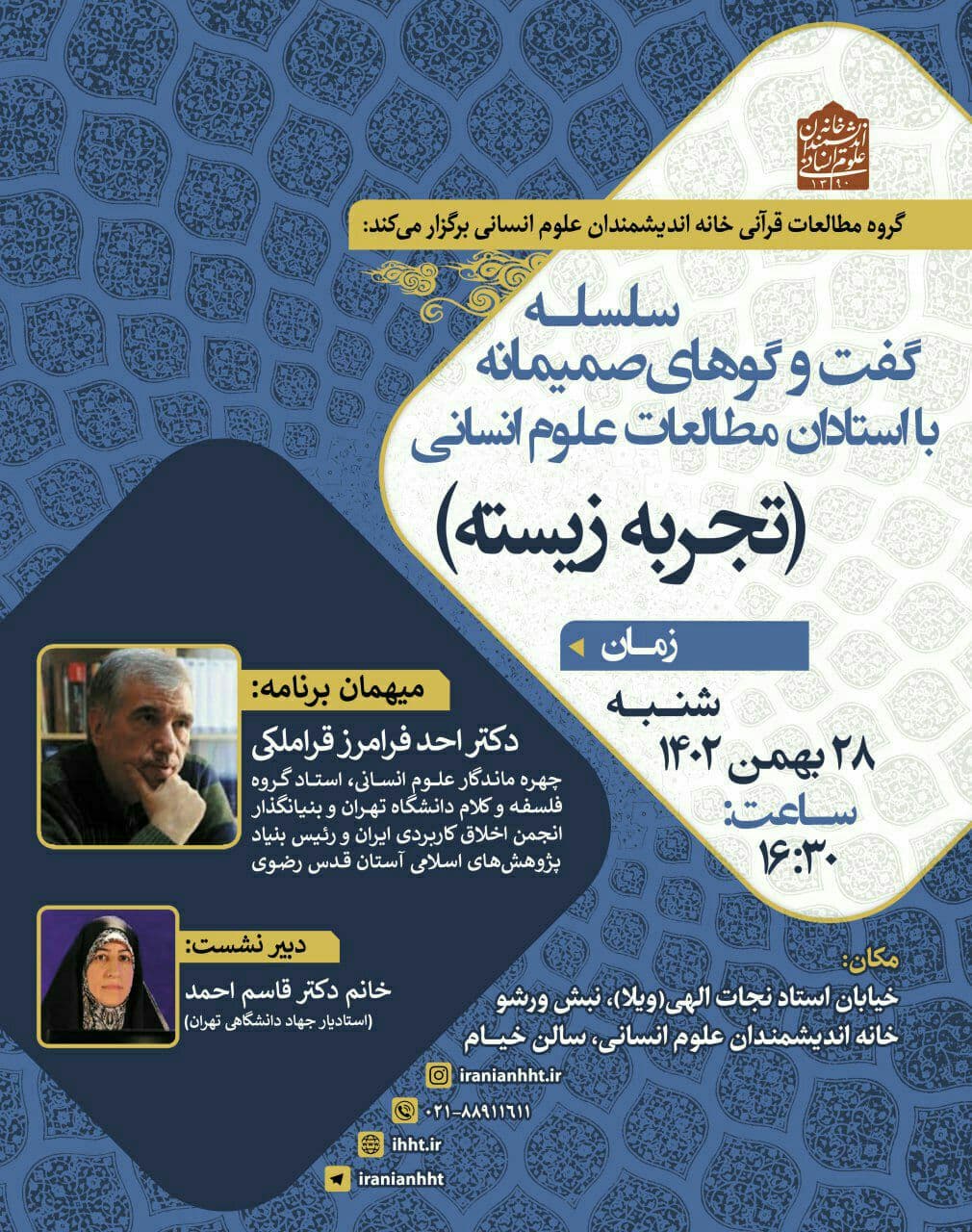 نشست "گپ و گفت با دکتر احد فرامرز قراملکی" روز شنبه ۲۸ بهمن در سالن فردوسی خانه اندیشمندان علوم انسانی برگزار می شود.