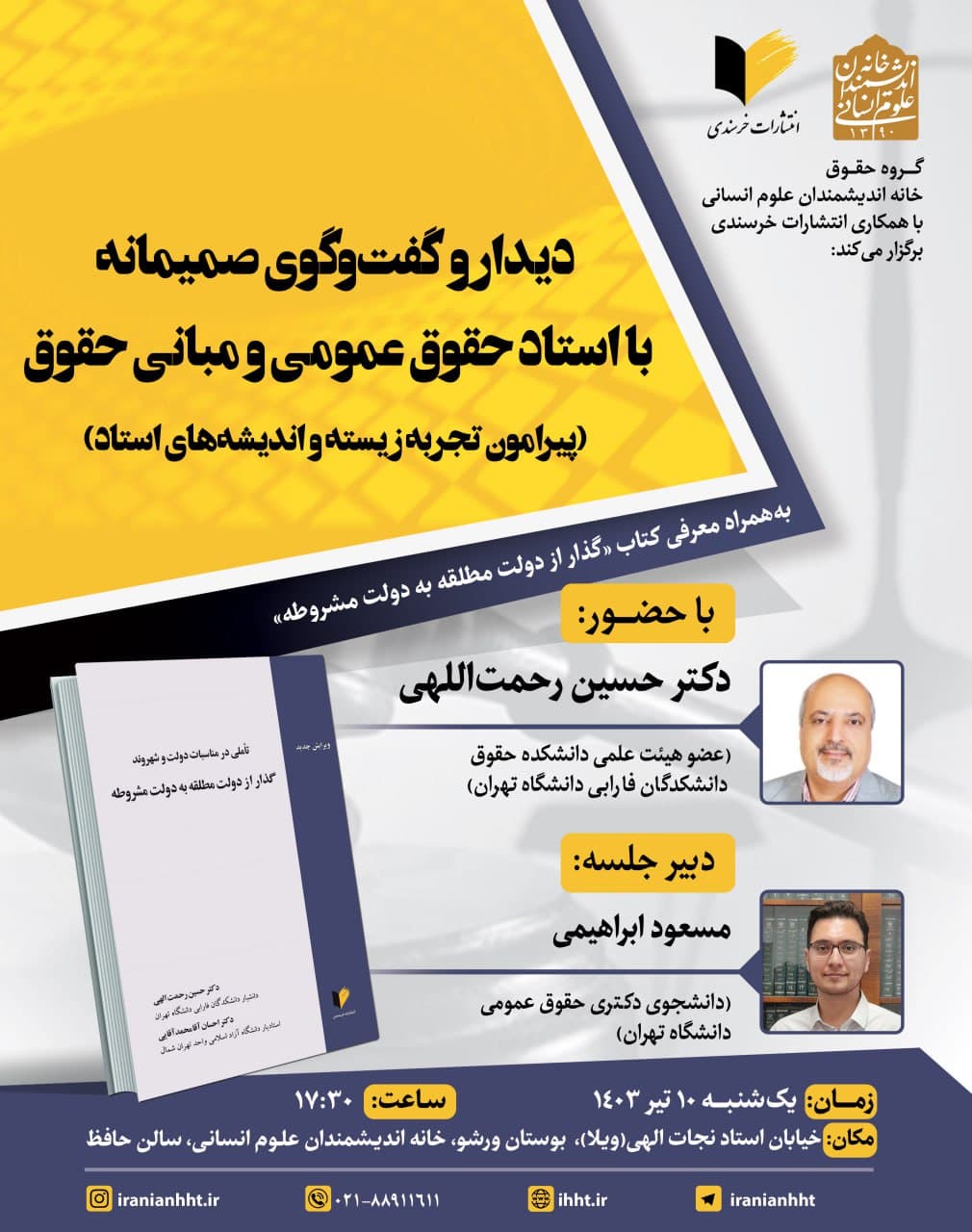 به گزارش روابط عمومی خانه اندیشمندان علوم انسانی، نشست "گپ و گفت با دکتر حسین رحمت اللهی" به همت گروه حقوق خانه اندیشمندان علوم انسانی و با همکاری انتشارات خرسندی، روز یکشنبه 10 تیر 1403 ساعت 17:30 در سالن حافظ خانه اندیشمندان علوم انسانی برگزار می شود.