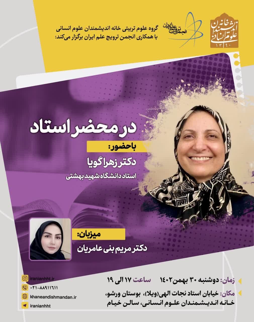 به گزارش روابط عمومی خانه اندیشمندان علوم انسانی، نشست "گپ و گفت با دکتر زهرا گویا" به همت گروه علوم تربیتی خانه اندیشمندان علوم انسانی، روز دوشنبه ۳۰ بهمن ۱۴۰۲ ساعت ۱۷ در سالن خیام خانه اندیشمندان علوم انسانی برگزار می شود.