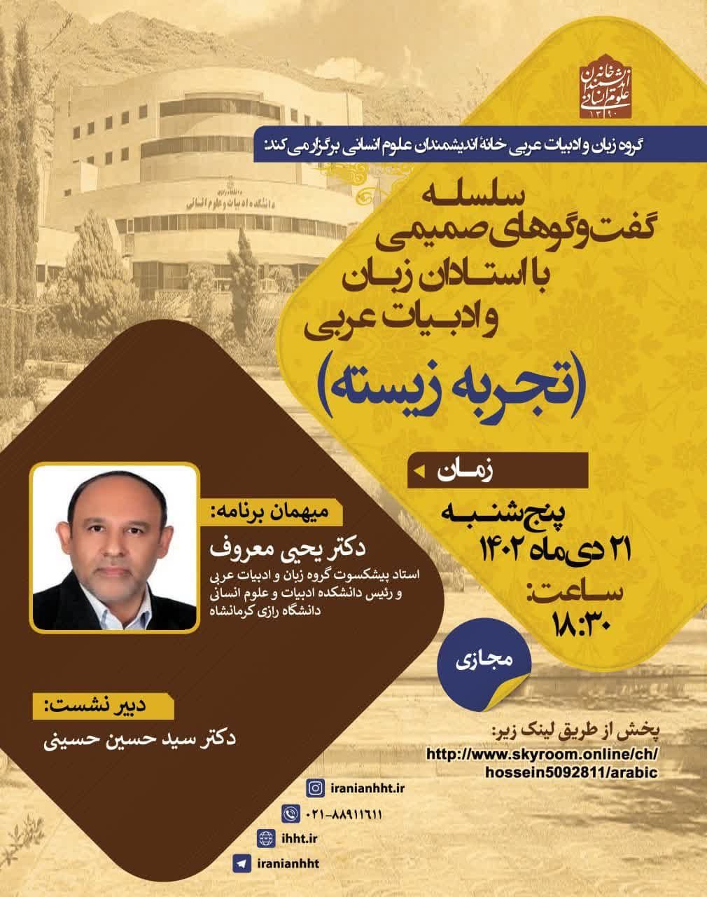 به گزارش روابط عمومی خانه اندیشمندان علوم انسانی، نشست "گپ و گفت با دکتر یحیی معروف" به همت گروه زبان و ادبیات عربی خانه اندیشمندان علوم انسانی، روز پنح شنبه ۲۱ دی ۱۴۰۲ ساعت ۱۸:۳۰ به صورت مجازی از طریق اسکای روم برگزار می شود.