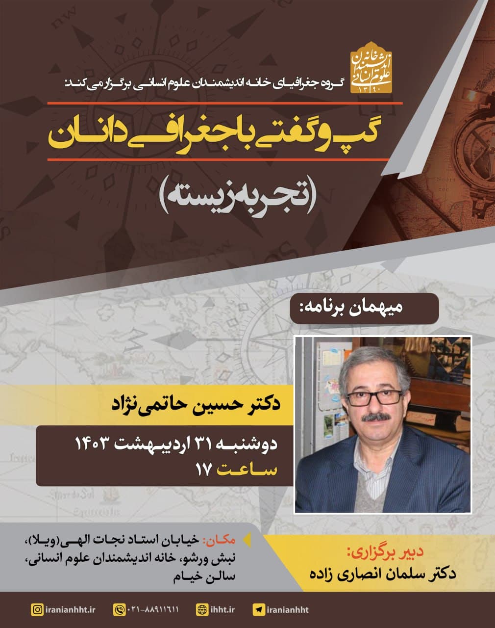 به گزارش روابط عمومی خانه اندیشمندان علوم انسانی، نشست "گپ و گفتی با دکتر حسین حاتمی نژاد" به همت گروه جغرافیای خانه اندیشمندان علوم انسانی، روز دوشنبه 31 اردیبهشت 1403 ساعت 17 در سالن خیام خانه اندیشمندان علوم انسانی برگزار می شود.