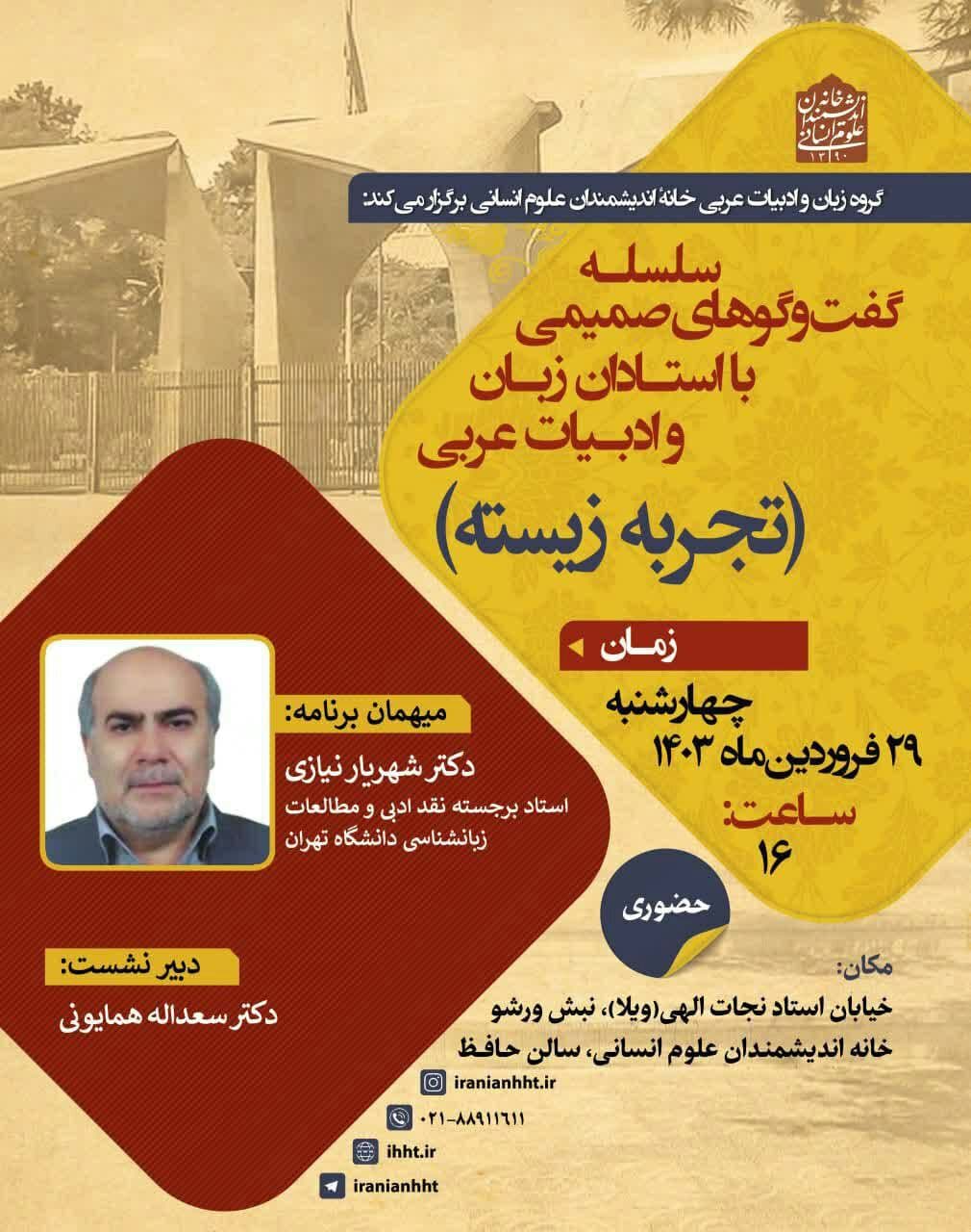 به گزارش روابط عمومی خانه اندیشمندان علوم انسانی، نشست "گپ و گفتی با دکتر شهریار نیازی" به همت گروه زبان و ادبیات عربی خانه اندیشمندان علوم انسانی، روز چهارشنبه ۲۹ فروردین ۱۴۰۳ ساعت ۱۶ برگزار می شود.