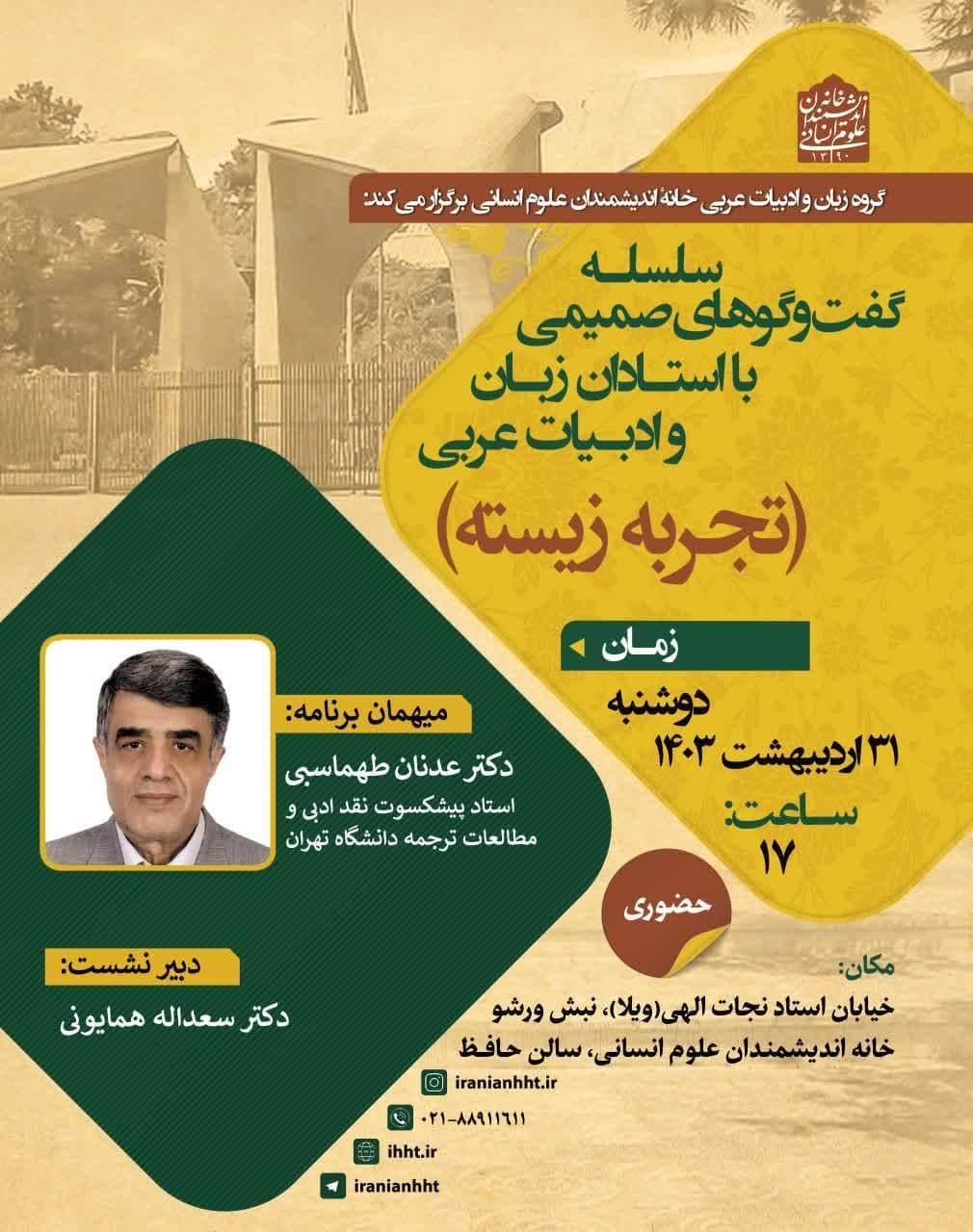 به گزارش روابط عمومی خانه اندیشمندان علوم انسانی، نشست "گپ وگفتی با دکتر عدنان طهماسبی" به همت گروه زبان و ادبیات عربی خانه اندیشمندان علوم انسانی، روز دوشنبه 31 اردیبهشت 1403 ساعت 17 در سالن حافظ خانه اندیشمندان علوم انسانی برگزار می شود.