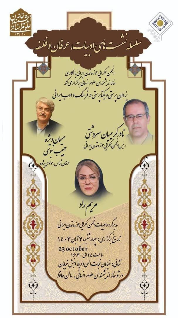 نشست "یزدان پرستی و یکتاپرستی در فرهنگ و ادب ایرانی" روز چهارشنبه 2 آبان در سالن حافظ خانه اندیشمندان علوم انسانی برگزار می شود.