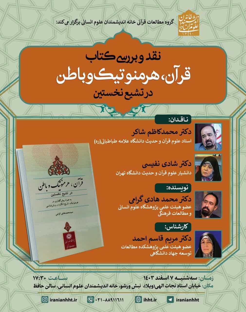 نشست "نقد و بررسی کتاب قرآن، هرمنوتیک و باطن در تشیع نخستین" روز سه شنبه 7 اسفند در سالن حافظ خانه اندیشمندان علوم انسانی برگزار می شود.