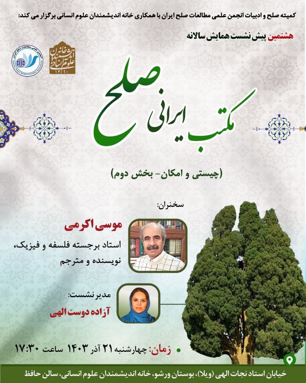هشتمین پیش نشست همایش سالانه انجمن علمی مطالعات صلح ایران، روز چهارشنبه 21 آذر در سالن حافظ خانه اندیشمندان علوم انسانی برگزار می شود.