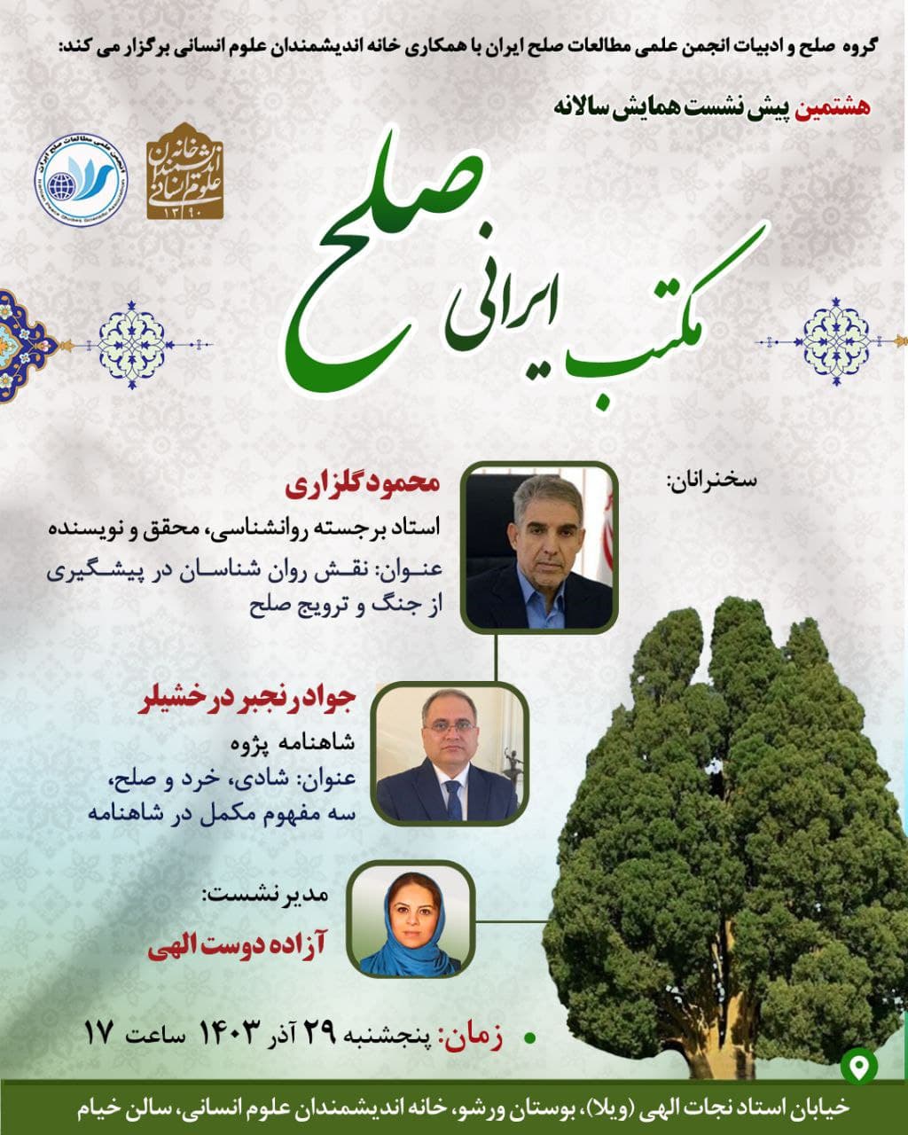 هشتمین پیش نشست همایش سالانه انجمن علمی مطالعات صلح ایران، روز پنج شنبه 29 آذر در سالن خیام خانه اندیشمندان علوم انسانی برگزار می شود.