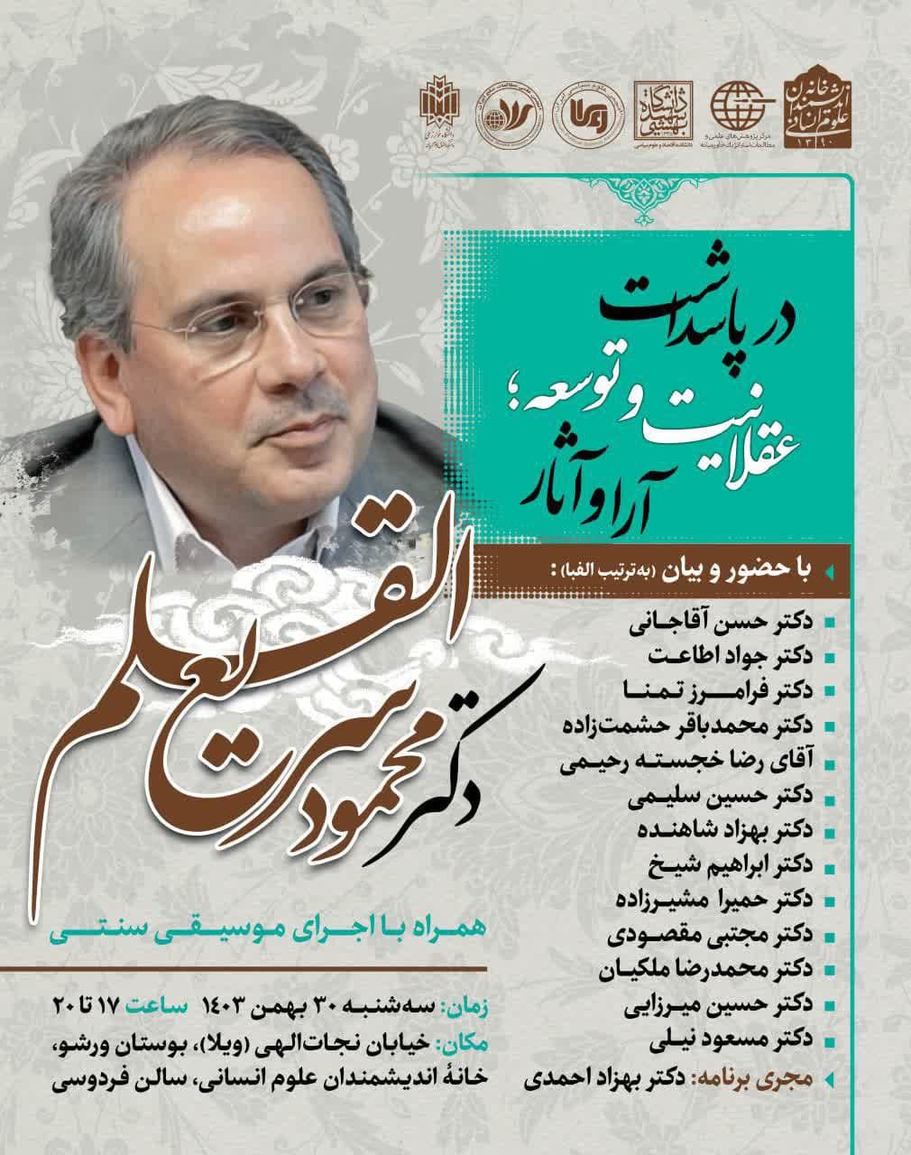 همایش "در پاسداشت عقلانیت و توسعه؛ آرا و آثار دکتر محمود سریع القلم" روز سه شنبه 30 بهمن در سالن فردوسی خانه اندیشمندان علوم انسانی برگزار می شود.