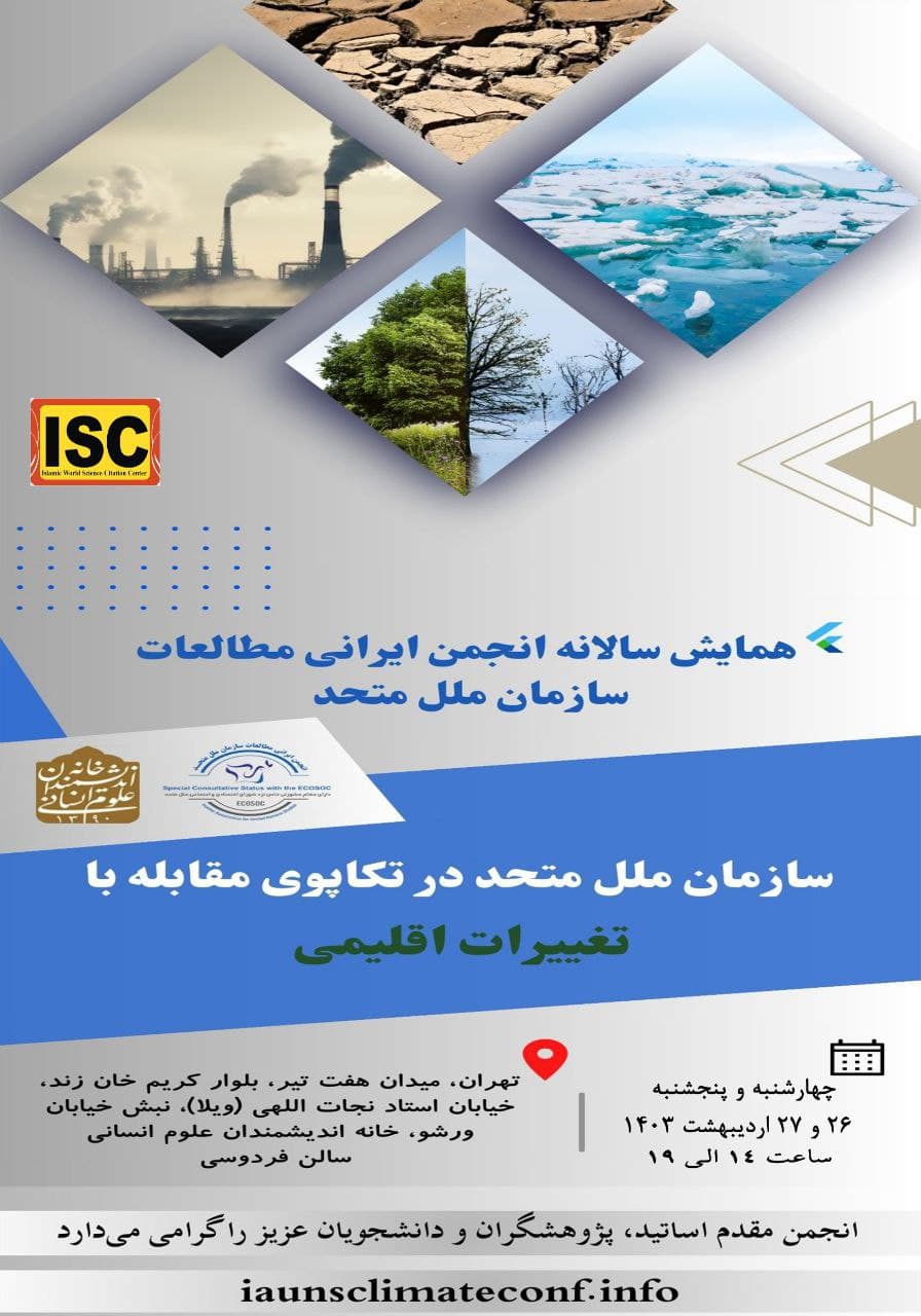 همایش "سازمان ملل متحد در تکاپوی مقابله با تغییرات اقلیمی" روزهای چهارشنبه و پنج شنبه 26 و 27 اردیبهشت در سالن فردوسی خانه اندیشمندان علوم انسانی برگزار می شود.