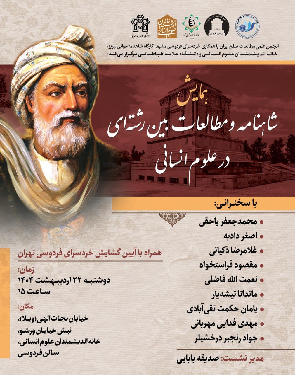به گزارش روابط عمومی خانه اندیشمندان علوم انسانی، همایش "شاهنامه و مطالعات بین رشته ای در علوم انسانی" به همت انجمن علمی مطالعات صلح ایران و با همکاری خردسرای فردوسی مشهد، کارگاه شاهنامه خوانی تبریز، خانه اندیشمندان علوم انسانی و دانشگاه علامه طباطبایی، روز دوشنبه 22 اردیبهشت 1404 ساعت 15 در سالن فردوسی خانه اندیشمندان علوم انسانی برگزار می شود.