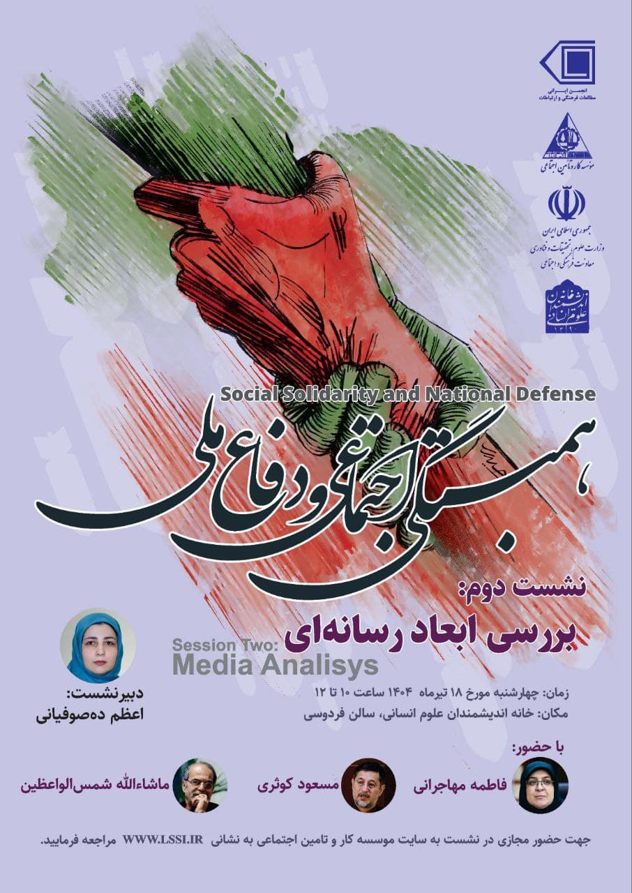 به گزارش روابط عمومی خانه اندیشمندان علوم انسانی، نشست دوم "همبستگی اجتماعی و دفاع ملی(بررسی ابعاد رسانه ای)" به همت انجمن ایرانی و مطالعات فرهنگی و ارتباطات و با همکاری خانه اندیشمندان علوم انسانی، روز چهارشنبه 18 تیر 1404 ساعت 10 در سالن حافظ خانه اندیشمندان علوم انسانی برگزار می شود.