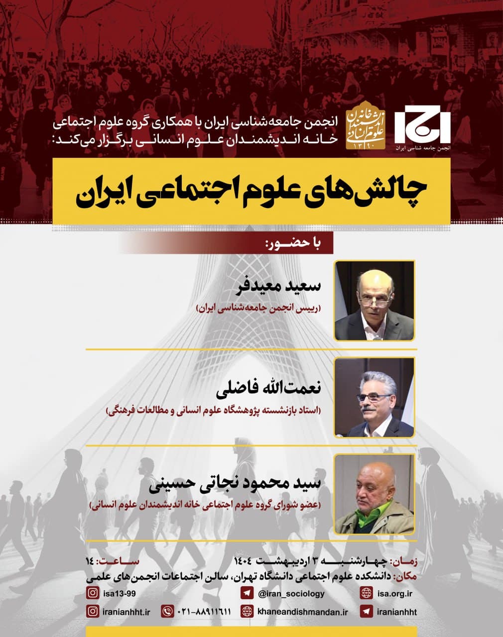 به گزارش روابط عمومی خانه اندیشمندان علوم انسانی، نشست "چالش های علوم اجتماعی ایران" به همت انجمن جامعه شناسی ایران و با همکاری گروه علوم اجتماعی خانه اندیشمندان علوم انسانی، روز چهارشنبه 3 اردیبهشت 1404 ساعت 14 در سالن اجتماعات دانشکده علوم اجتماعی دانشگاه تهران برگزار می شود.