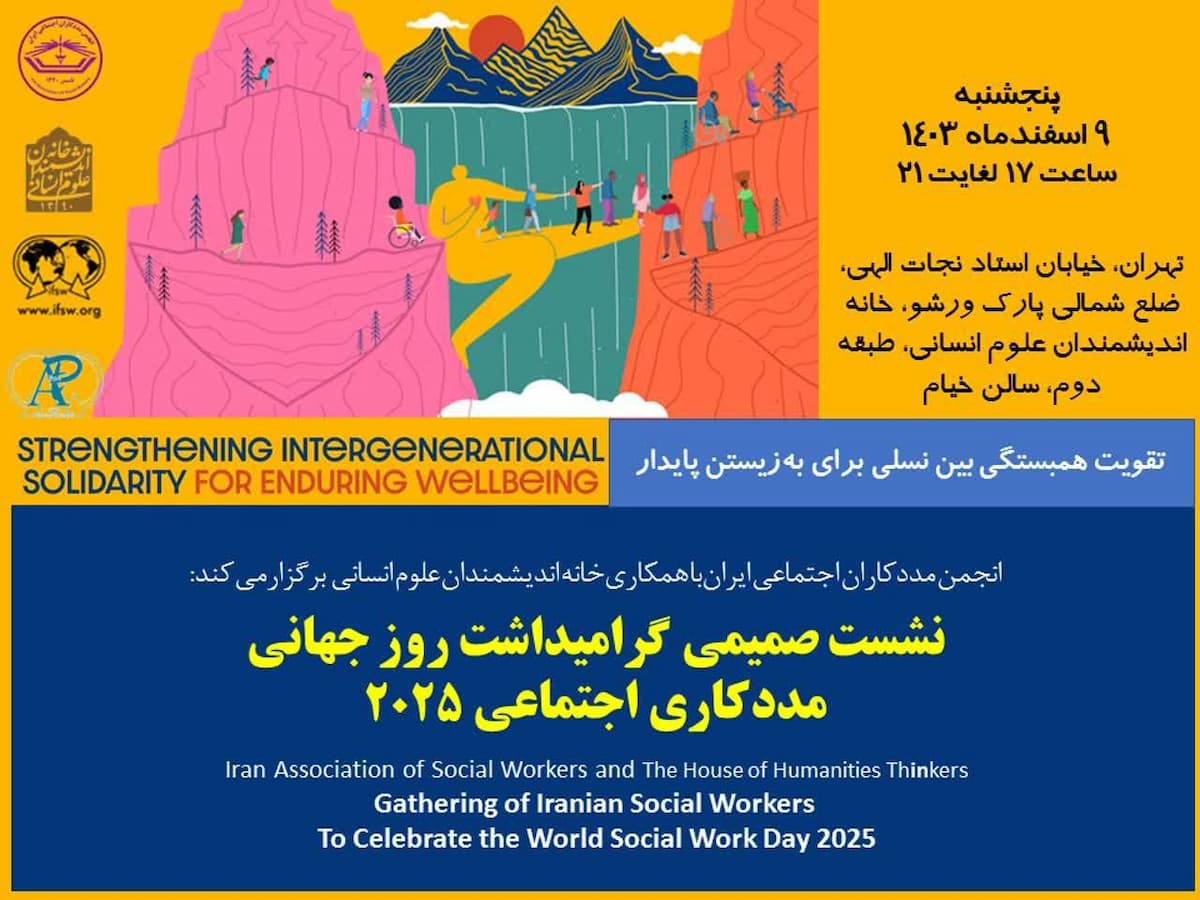 به گزارش روابط عمومی خانه اندیشمندان علوم انسانی، نشست "گرامیداشت روز جهانی مددکاری اجتماعی 2025" به همت انجمن مددکاران اجتماعی ایران و با همکاری خانه اندیشمندان علوم انسانی، روز پنج شنبه 9 اسفند 1403 ساعت 17 در سالن خیام خانه اندیشمندان علوم انسانی برگزار می شود.