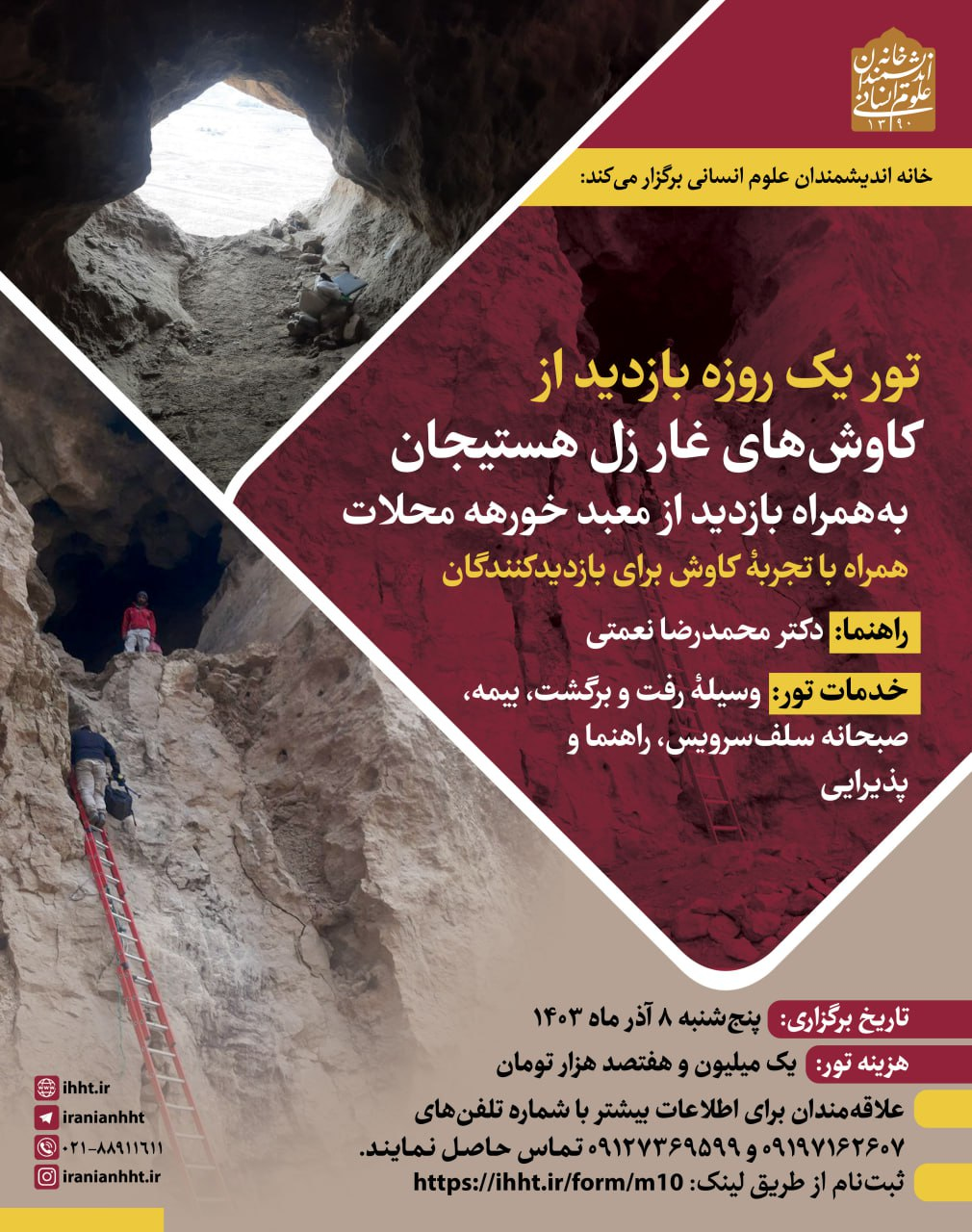 خانه اندیشمندان علوم انسانی برگزار می کند: تور یک روزه بازدید از کاوش های غار زل هستیجان به همراه بازدید از معبد خورهه محلات همراه با تجربه کاوش برای بازدیدکنندگان راهنما: دکتر محمدرضا نعمتی خدمات تور: وسیله رفت و برگشت، بیمه، صبحانه سلف سرویس، راهنما و پذیرایی میان وعده تاریخ برگزاری: پنج شنبه 8 آذر 1403 هزینه تور: یک میلیون و هفتصد هزار تومان علاقمندان برای اطلاعات بیشتر به شماره تلفن های 09197162607 و 09127369599 تماس حاصل نمایند. شماره کارت جهت واریز هزینه 5047061090164191