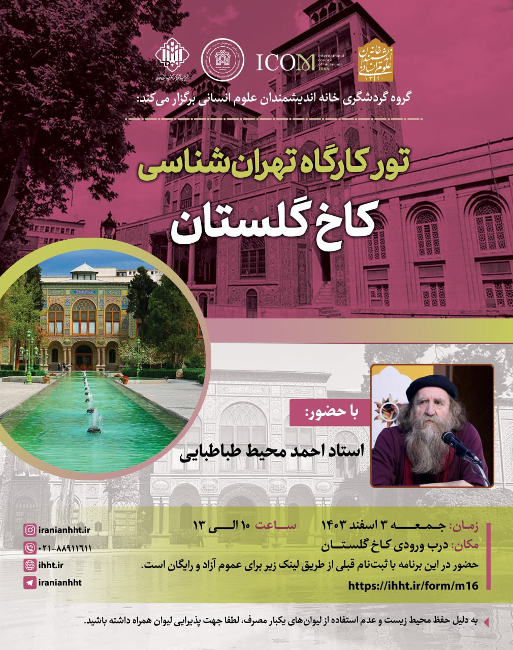 گروه گردشگری خانه اندیشمندان علوم انسانی برگزار می کند: تور کارگاه تهران شناسی؛ کاخ گلستان با حضور: استاد احمد محیط طباطبایی زمان: جمعه 3 اسفند 1403 ساعت 10 صبح مکان: درب ورودی کاخ گلستان 🔹حضور در این برنامه با ثبت نام قبلی از طریق لینک زیر برای عموم آزاد و رایگان است (ظرفیت تور محدود، اولویت با زمان ثبت نام می باشد). 🔹لطفا جهت پذیرایی لیوان همراه داشته باشید.