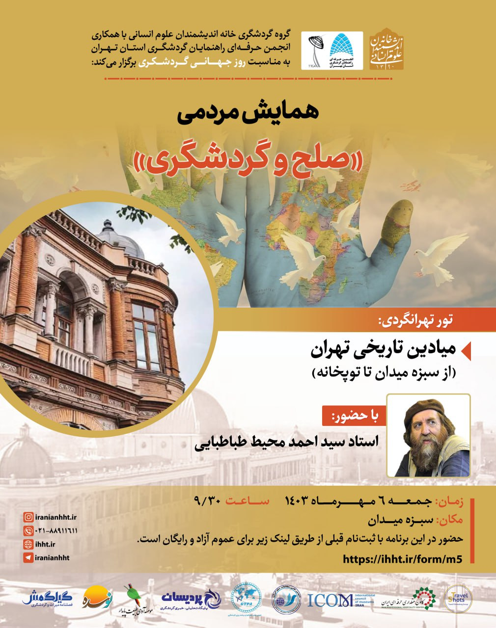 گروه گردشگری خانه اندیشمندان علوم انسانی با همکاری انجمن صنفی راهنمایان تهران، به مناسبت روز جهانی گردشگری برگزار می کند: تور تهرانگردی میادین تاریخی تهران با حضور: سید احمد محیط طباطبایی جمعه 6 مهر 1403 ساعت 9:30